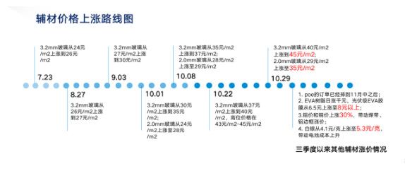 與此同時,占光伏膠膜成本90%以上的EVA近幾周漲幅25%。輔材成本占到光伏組件成本的35%,其中光伏膠膜占15%,即總成本的5.25%,此次漲價25%,組件售價需要隨之上浮1.31%,以目前組件1.7元/W的售價計算,由于EVA上漲帶來的成本增加約為2.2分/W。