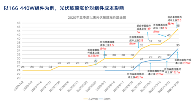 從今年7月的24元/平米,到近幾天剛剛上調到的50元/平米,光伏玻璃價格數月間上漲了近108%,正式跨入暴利行業。3.2mm玻璃從42上漲到50塊錢,對166單面影響5分錢/W,210組件影響約4分錢/W。