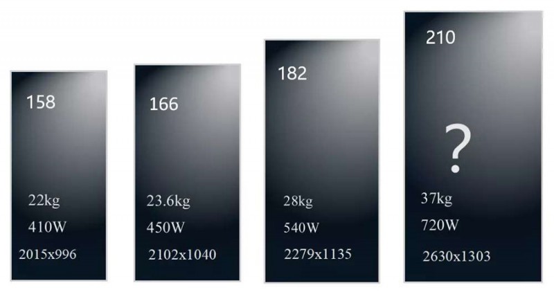 按這樣的邏輯,210硅片所對(duì)應(yīng)的組件應(yīng)該是720W?這樣的組件對(duì)應(yīng)尺寸已經(jīng)到了2. 6米長(zhǎng),1.3米寬,重量達(dá)到37kg,這與當(dāng)下的產(chǎn)業(yè)鏈配套顯然存在問題。行業(yè)里也早已有共同的認(rèn)知:不要單純?yōu)榱颂岣呓M件功率把組件越做越大。