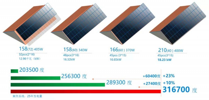 在這個(gè)案例下,使用210的400W小組件,裝機(jī)容量比158組件提高12%,比166組件提高10%,通過更大的裝機(jī)容量可以提高系統(tǒng)發(fā)電量,給用戶帶來每年更高的項(xiàng)目收益。