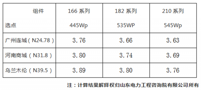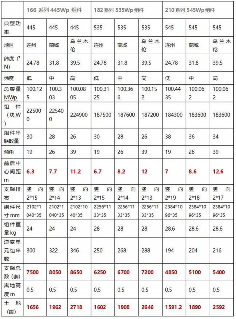 山東電力工程咨詢院有限公司針對目前市面上主流的組件類型(166型445Wp組件、182型535Wp組件、210型545Wp組件),以及不同緯度(北緯24.8°廣州連城、北緯31.8°河南商城、北緯39.5°內蒙烏蘭木倫)的資源環境條件,做了詳細的工程量計算和成本分析。