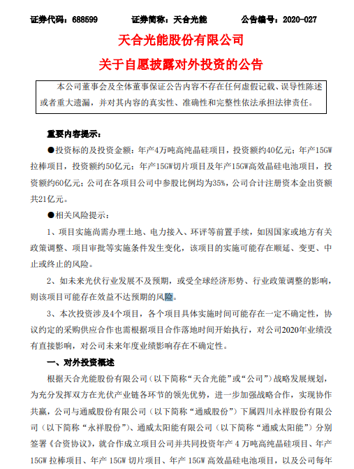 光伏產(chǎn)業(yè)鏈各環(huán)節(jié)的領(lǐng)先優(yōu)勢,進(jìn)一步加強(qiáng)戰(zhàn)略合作,實(shí)現(xiàn)協(xié)作共贏,天合光能與通威股份有限公司下屬四川永祥股份有限公司、通威太陽能有限公司分別簽署《合資協(xié)議》,就合作成立項(xiàng)目公司并共同投資年產(chǎn) 4 萬噸高純晶硅項(xiàng)目、年產(chǎn)15GW 拉棒項(xiàng)目、年產(chǎn) 15GW 切片項(xiàng)目、年產(chǎn) 15GW 高效晶硅電池項(xiàng)目,以及公司每年向合作項(xiàng)目公司采購高效晶硅電池等相關(guān)事項(xiàng)達(dá)成合作協(xié)議。根據(jù)協(xié)議約定,公司在各項(xiàng)目公司中參股比例均為35%,合計(jì)注冊資本出資額約為21億元。