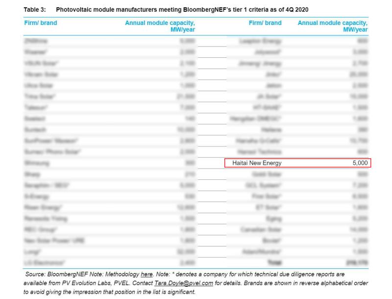 該評級體系分為三個等級,其中第一梯隊制造商的評判標準最為嚴格,企業須證明其能為六個不同項目提供自主品牌、自行生產的組件產品,且這些項目須獲得六家不同商業銀行的無追索權融資。由于Tier 1供應商評選資格嚴苛,常被作為公平客觀且極具可信度的參考資料運用于行業生產預測、主要競爭對手分析等行業分析中。