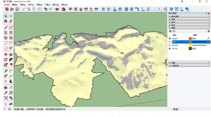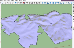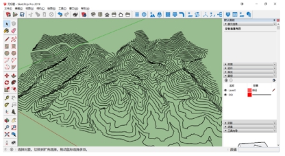 第一步:導入等高線地圖。將處理過的平面等高線地形圖輸入SketchUp可以生成相應的3D山地等高線地形圖。如圖1草圖大師生成的3D山地等高線地形圖。設計師此時在軟件界面上就可以更直觀的對設計對象的地形地貌有一個全面的了解。為了更加的直觀和真實,下一步會將等高線圖轉化為山體的表面。