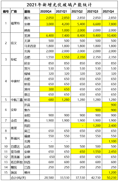 2021年是光伏玻璃產(chǎn)能投放的大年,光伏玻璃將會經(jīng)歷緊缺、結(jié)構性緊缺、和全面滿足需求的階段。下面這張表格是我分季度統(tǒng)計的各家明年新增產(chǎn)能情況,其中標黃的位置代表產(chǎn)能發(fā)生變化的時間節(jié)點: