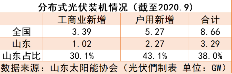 在中國光伏協會和光伏們主辦的第四屆分布式光伏嘉年華會議上,山東省太陽能行業協會執行秘書長張曉斌介紹,截止2020年9月底,山東省分布式累計裝機已超12GW,新增3.29GW,新增占比38%,工商業和戶用光伏再創新高。繼全國光伏裝機第一省之后,山東正朝著“分布式光伏第一大省”方向邁進。