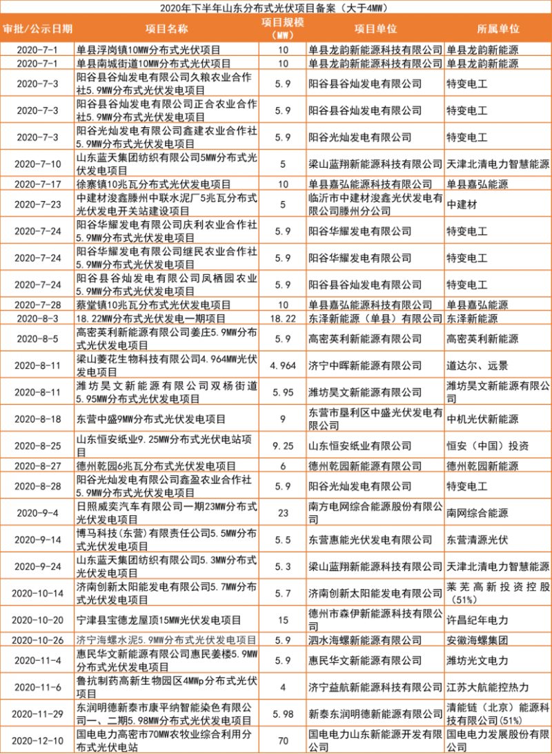在此前光伏們統計的2020年下半年1.4GW分布式光伏新備案項目中(詳情請看《1.4GW分布式光伏新備案項目一覽:華能領銜,隆基、特變、華電、大唐“入局”》)。山東的分布式落地項目接近300MW,有數十家民營、中小微企業布局了分布式光伏項目,其中也不乏有特變電工、遠景、道達爾等知名企業,足以可見投資商們對山東分布式光伏的熱情和決心。