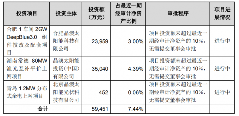 此外,根據公告,晶澳太陽能近期還有3個正在審批中且尚未達到董事會審議標準的對外投資事項,3個項目投資總額達5.9451億元,分別為:合肥1車間2GWDeepBlue3.0組件技改及配套項目、湖南常德80MW漁光互補平價上網項目、青島1.2MW分布式余電上網項目。公告顯示以上三個項目項目投資額未超過最近一期經審計凈資產的10%,無需提交董事會審批。詳情如下: