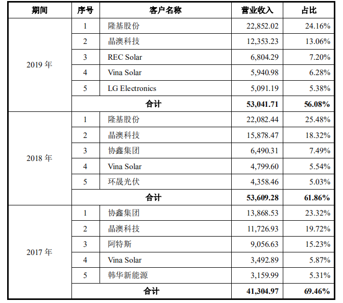 明冠新材近三年(2017年至2019年)以來的核心客戶還包括:協鑫集團、LG、韓華新能源、環晟光伏等,它們均進入了該背板廠商的前五大客戶名單中。