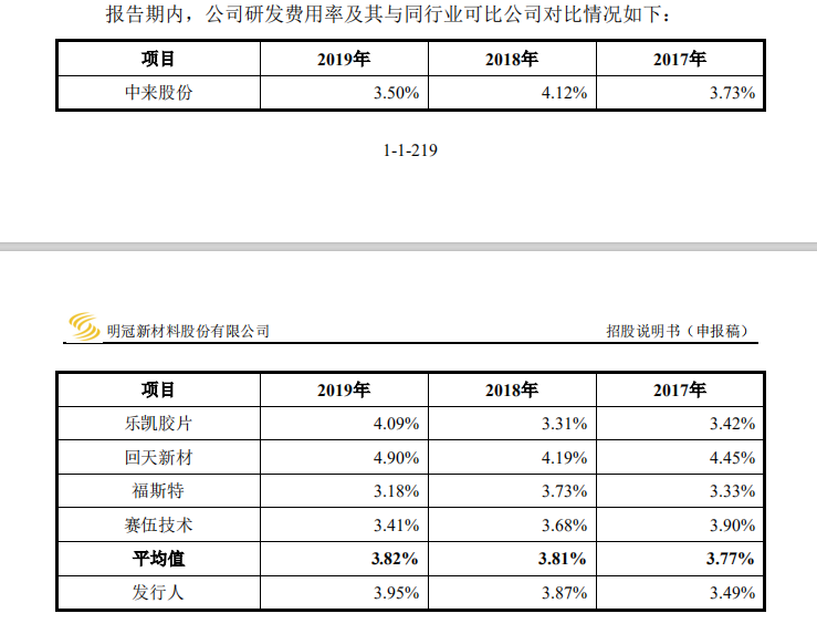 研發費用方面,明冠新材于去年的比值高于平均水平,但相比回天新材和樂凱膠片的4%以上,仍然有一定差距。
