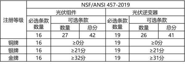 目前,EPEAT覆蓋的領(lǐng)域包括計算機(jī)和顯示器、影像設(shè)備、電視、手機(jī)、光伏組件和逆變器,并針對各領(lǐng)域分別制定了不同的評價標(biāo)準(zhǔn)。綠色電子委員會于2019年發(fā)布了光伏組件和逆變器的評價標(biāo)準(zhǔn)NSF/ANSI 457(光伏組件和逆變器的可持續(xù)發(fā)展標(biāo)準(zhǔn))。根據(jù)EPEAT注冊系統(tǒng)對列名產(chǎn)品的標(biāo)準(zhǔn)符合程度,分為金、銀、銅三個等級,光伏組件和逆變器產(chǎn)品注冊商需要分別滿足NSF/ANSI 457-2019標(biāo)準(zhǔn)內(nèi)16和19個必選條款及不同等級對應(yīng)分值的可選條款。