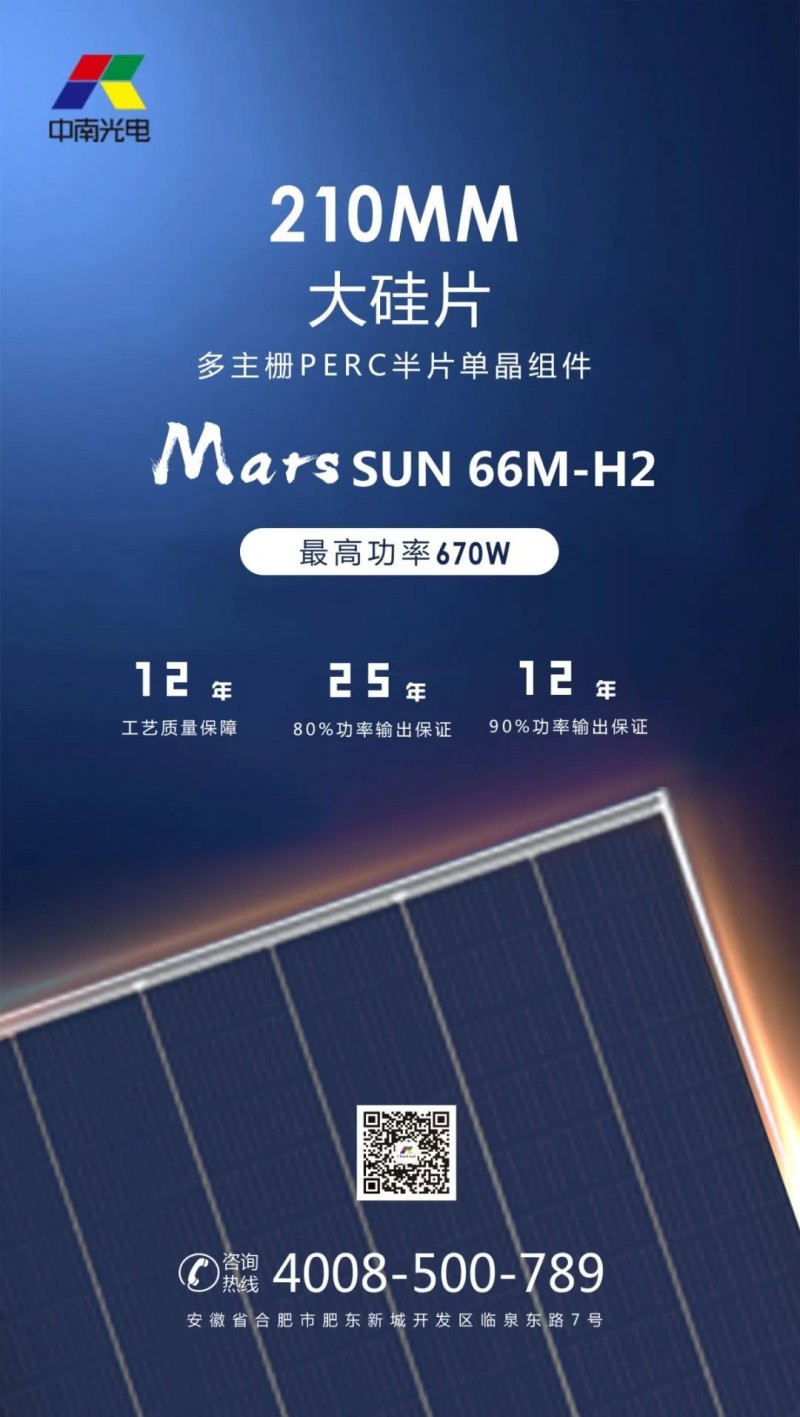 在光伏產業即將開啟平價新時代之際,更高效率和更大功率的組件正在成為主流。尤其是在2019年末,210mm尺寸的大硅片迭代而來。中南光電率先推出500W、550W、670W Mars系列超高功率組件,采用210mm電池、多主柵、半片切割等領先技術,將光伏從4.0時代帶到了5.0時代,再到6.0時代。