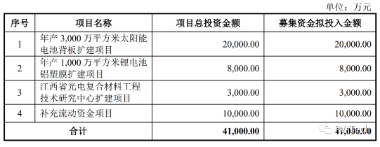 根據招股說明書,明冠新材本次擬發行不超過4102.2萬股,募集資金4.1億元,主要用于年產3000萬平方米太陽能電池背板擴建項目、年產1000萬平方米鋰電池鋁塑膜擴建項目、江西省光電復合材料工程技術研究中心擴建項目、補充流動資金項目。