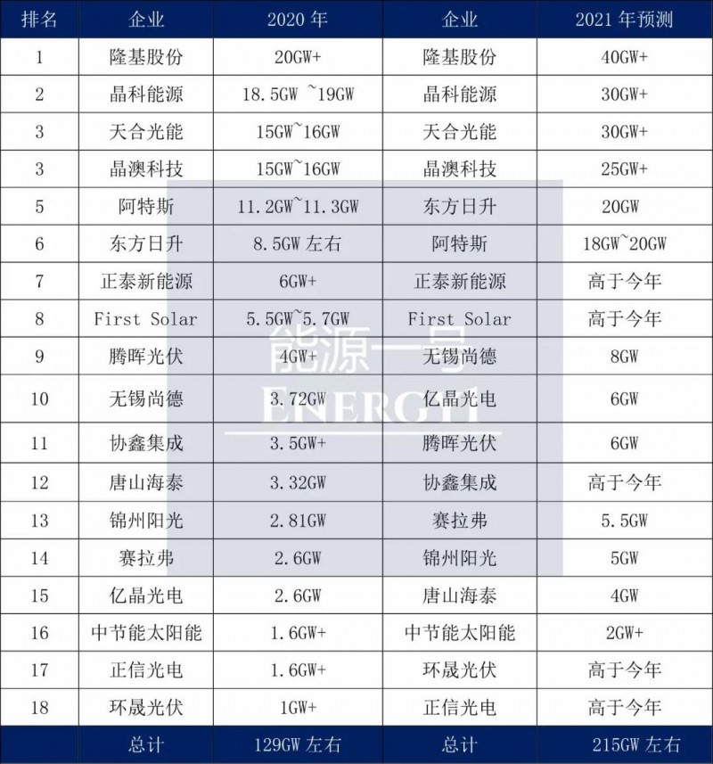 結(jié)合市場調(diào)研、各方詢問及統(tǒng)計,全球首發(fā)這張集合全球核心廠商的組件出貨量榜單,以求更客觀、更具體、更立體地呈現(xiàn)下游產(chǎn)業(yè)的全貌。榜單中可以看到,今年這些企業(yè)的總出貨約129GW,2021年的出貨量預(yù)計高達(dá)215GW。