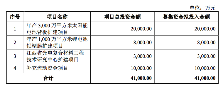 根據招股說明書顯示,明冠新材將募集4.1億資金用于年產3000萬平方米太陽能電池背板擴建項目、年產1000萬平方米鋰電池鋁塑膜擴建項目、江西省光電復合材料工程技術研究中心擴建項目、補充流動資金項目。