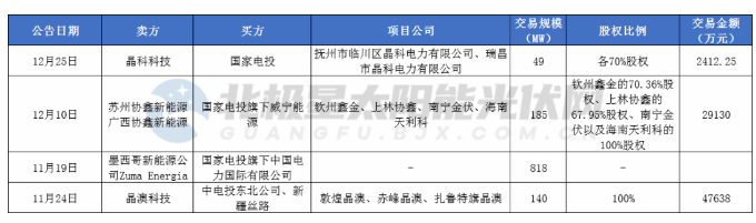 根據統計,國家電投收購交易集中在年底進行,11月24日,國家電投與晶澳科技進行合計140MW光伏電站交易,交易總額47638萬元;12月10日,國家電投旗下威寧能源以29130萬元購入協鑫新能源185MW光伏電站;12月25日,國家電投與晶科科技以2412.25萬元達成晶科旗下兩子公司各70%股權,涉及光伏電站規模49MW。