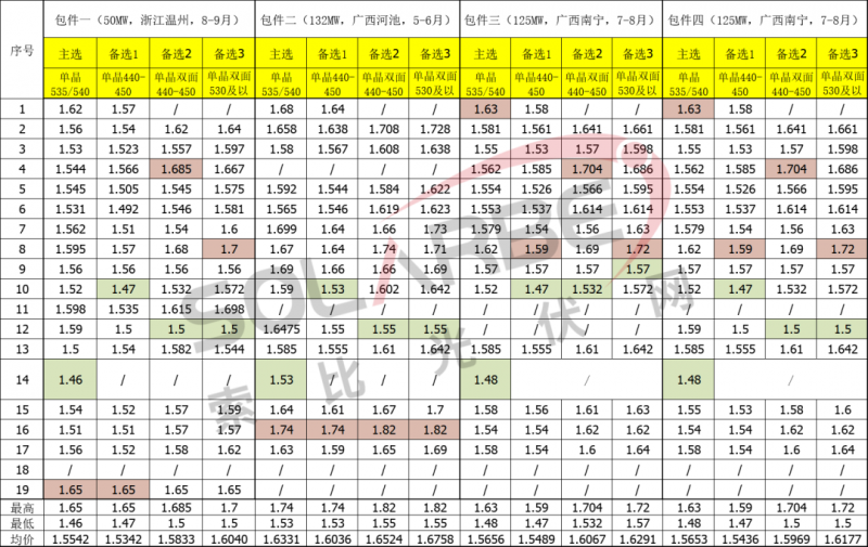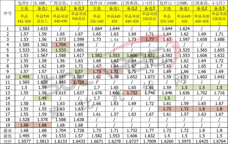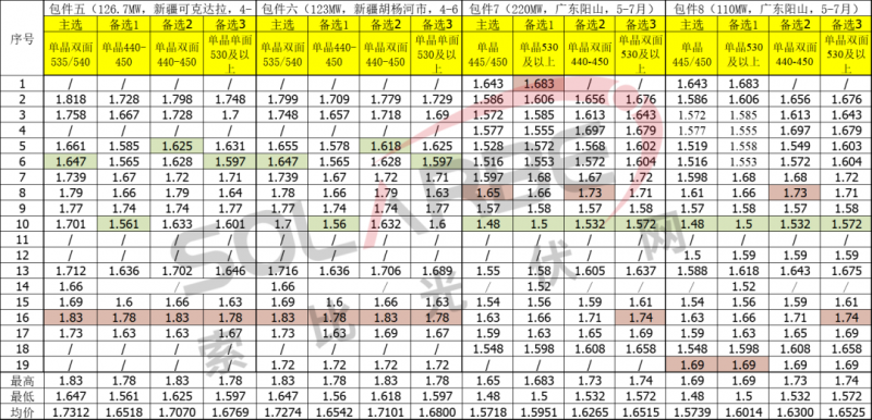 本次招標采用“主選型號+3備選型號”的方式分別報價。從功率看,多數(shù)包件的主選型號為535-540W單晶組件,以445-450W單晶組件為備選,包件7-9反之。單、雙面來看,多數(shù)項目以單面組件作為主選產(chǎn)品,只有新疆的包件5、6以雙面發(fā)電組件為首選。
