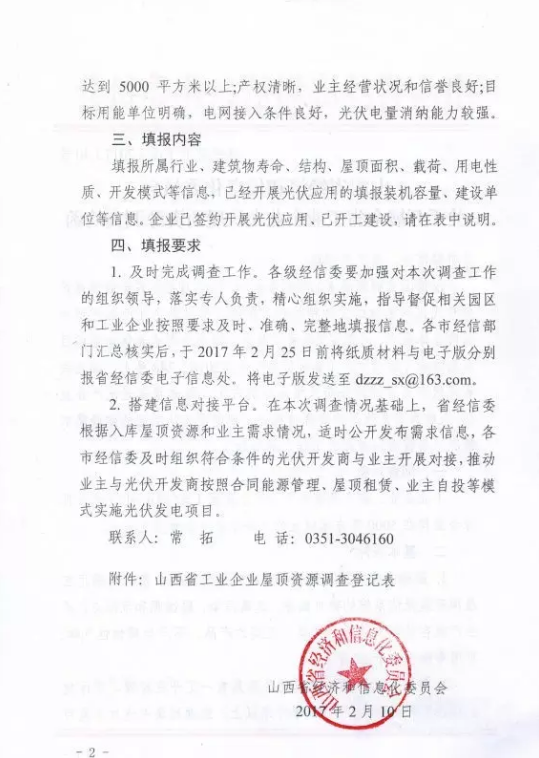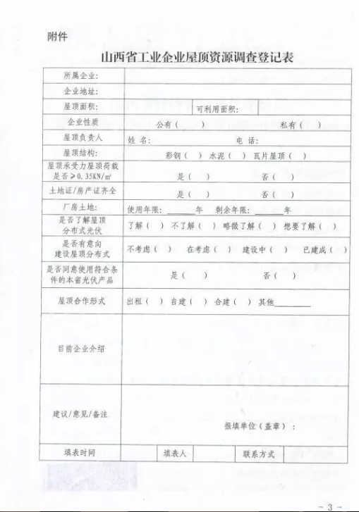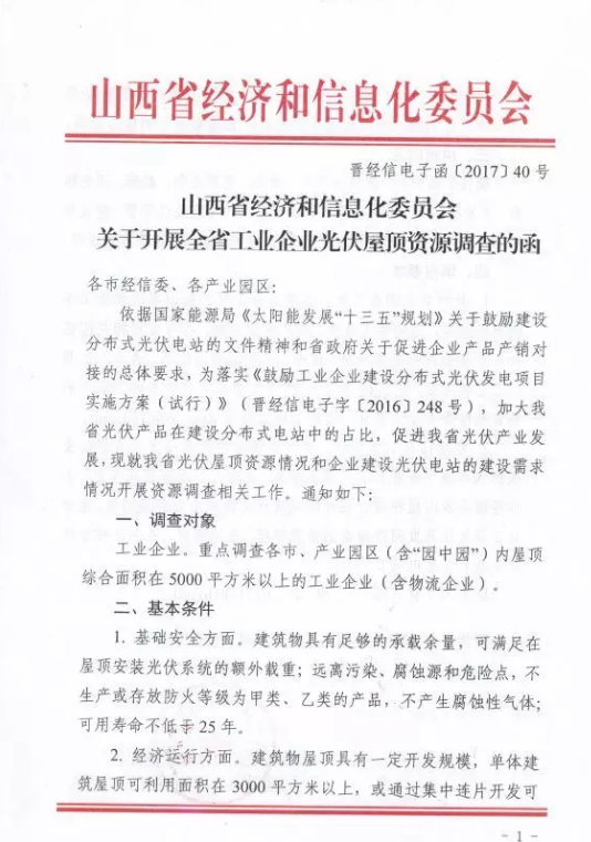 昨日,記者從山西省經(jīng)信委獲悉。為落實山西省鼓勵工業(yè)企業(yè)建設分布式光伏發(fā)電 項目實施方案 (試行)政策。2月10日,山西省經(jīng)信委印發(fā)《關于開展全省工業(yè)企業(yè)光伏屋頂資源調查的函》晉經(jīng)信電子函〔2017〕40號文件。要求全省經(jīng)信委、產業(yè)園區(qū)對轄區(qū)內符合條件的工業(yè)企業(yè)進行資源調查。并于2月22日之前將紙質材料上報。