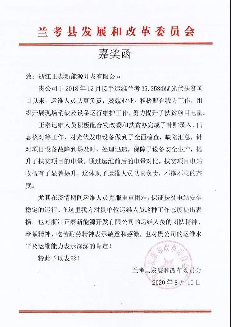 自正泰運維蘭考縣光伏扶貧電站以來,得到縣發改委等部門的大力協助與悉心關懷。正泰運維團隊四季常駐,頂烈日、冒嚴寒,守護這片“鐵桿莊稼”,發電量大幅提升,2018-2020年,蘭考縣光伏扶貧項目年發電量從2119.98萬kWh增長至3599.81萬kWh,同比增長169.8%。特別是在2020年疫情期間,正泰運維團隊克服重重困難,保障電站安全穩定生產,維護電站扶貧效益,得到了蘭考縣發展和改革委員會致函嘉獎,大力肯定了正泰運維服務水平和能力。目前該項目運行穩定,效益得到了有效保障。