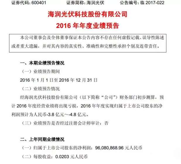如此稱王倒也罷了,但該股還是給了小散們更多的“驚喜”。海潤(rùn)光伏1月26日公告,經(jīng)公司財(cái)務(wù)部門(mén)初步測(cè)算,預(yù)計(jì)2016年度經(jīng)營(yíng)業(yè)績(jī)將出現(xiàn)虧損,2016 年年度實(shí)現(xiàn)歸屬于上市公司股東的凈利潤(rùn)預(yù)計(jì)為人民幣-3.8 億元~-4.8 億元。而前三季度尚且盈利4528萬(wàn)元,對(duì)比去年同期,公司盈利9608萬(wàn)元,業(yè)績(jī)大變臉的把戲在該股的歷史上早已有之。