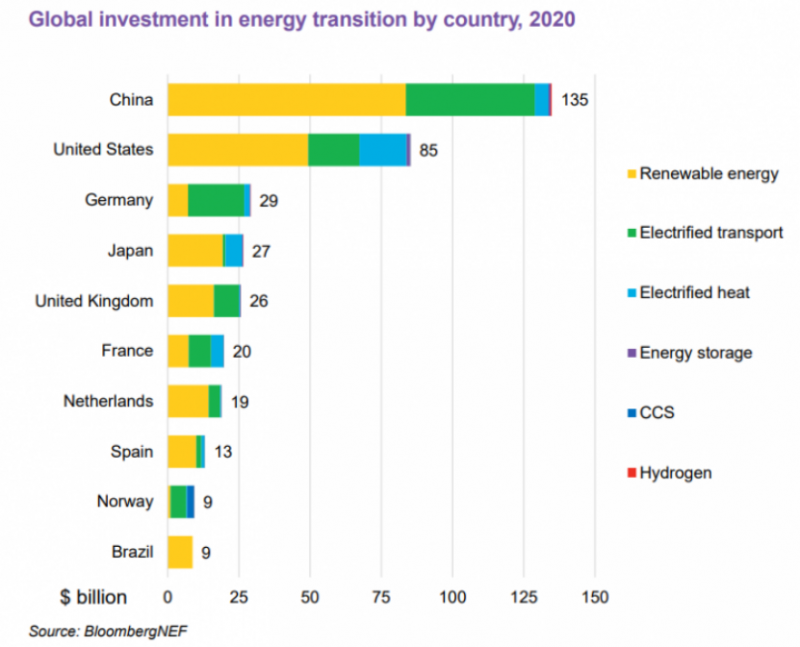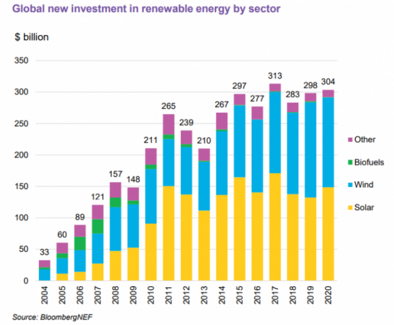 圖片:彭博新能源財經(jīng)2020年按行業(yè)分類的可再生能源投資數(shù)據(jù)。來源:BNEF