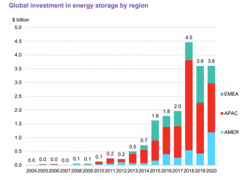 截至2020年,全球累計向儲能項目投入36億美元,與2019年的數(shù)字一致。盡管報告中發(fā)現(xiàn)歐洲、中東和非洲的投資明顯放緩,資金僅為6億美元,但美洲去年在儲能方面的投資達(dá)到了“創(chuàng)紀(jì)錄”的12億美元。