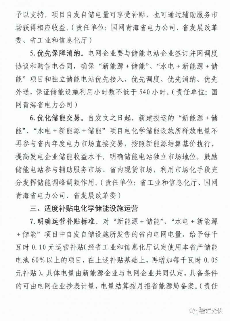 4)對"新能源+儲能” 、"水電+新能源 + 儲能”項目中自發自儲設施所發售的省內電網電量,給予每千瓦時0.10元運營補貼(經省工業和信息化廳認定使用本省產儲能 電池 60%以上的項目,在上述補貼基礎上,再增加每千瓦時0.05 元補貼),具體電量由新能源企業與電網企業共同認定,具備條件 的可由電網企業抄表計量,電量結算按月報省能源局備案。