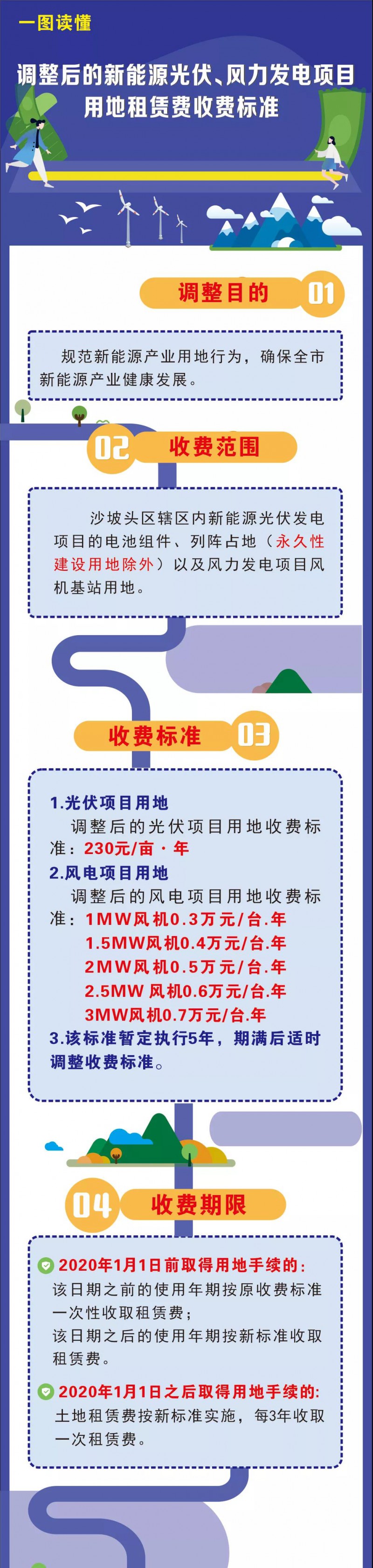 為規(guī)范新能源產(chǎn)業(yè)用地行為,確保全市新能源產(chǎn)業(yè)健康發(fā)展,決定對(duì)我市沙坡頭區(qū)新能源光伏、風(fēng)力發(fā)電項(xiàng)目土地租賃費(fèi)收費(fèi)標(biāo)準(zhǔn)進(jìn)行調(diào)整。現(xiàn)將有關(guān)事宜通知如下: