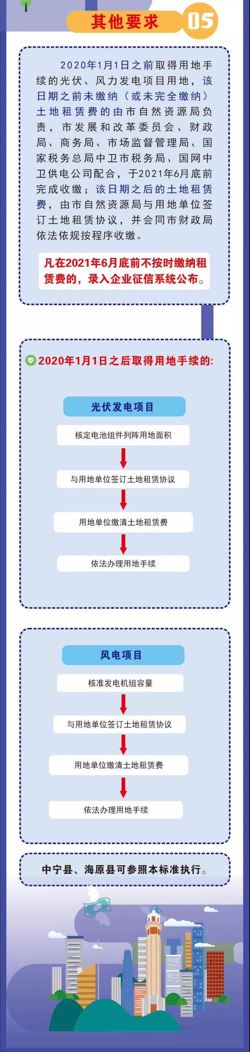 (一)2020年1月1日之前取得用地手續(xù)的光伏、風(fēng)力發(fā)電項(xiàng)目用地,該日期之前未繳納(或未完全繳納)土地租賃費(fèi)的,由市自然資源局負(fù)責(zé),市發(fā)展和改革委員會(huì)、財(cái)政局、商務(wù)局、市場(chǎng)監(jiān)督管理局、國(guó)家稅務(wù)總局中衛(wèi)市稅務(wù)局、國(guó)網(wǎng)中衛(wèi)供電公司配合,于2021年6月底前完成收繳;該日期之后的土地租賃費(fèi),由市自然資源局與用地單位簽訂土地租賃協(xié)議,并會(huì)同市財(cái)政局依法依規(guī)按程序收繳。凡在2021年6月底前不按時(shí)繳納租賃費(fèi)的,錄入企業(yè)征信系統(tǒng)公布。