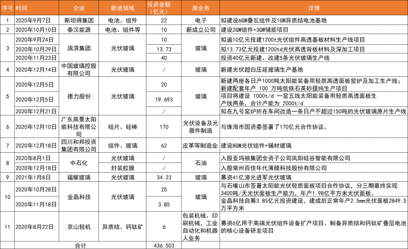 與此同時,高額利潤迅速吸引了超過7家企業(yè)加速入局光伏玻璃,包括中石化、旗濱集團、德力股份、金晶科技等,涉及投資金額228.5億元。由于光伏玻璃所用的超白壓延玻璃利潤要遠高于普通的建筑玻璃,所以入局企業(yè)中不乏有一些從建筑玻璃行業(yè)跨界的企業(yè)。