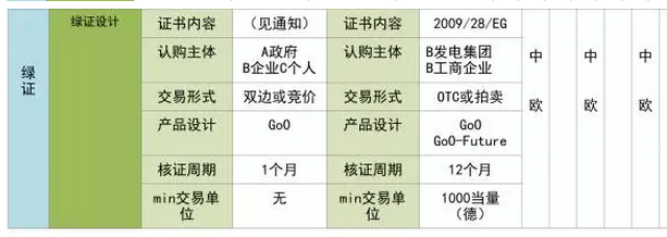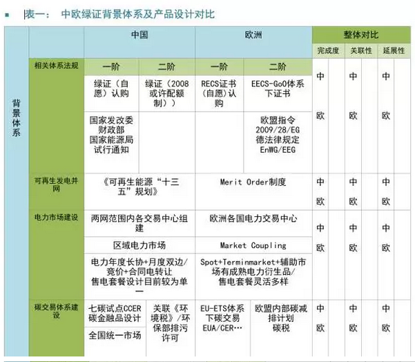 表中依據(jù)圖一思路做了中歐能源體系中主要分支羅列對比,以及綠色證書設(shè)計的一些不同之處,并且將各項指標(biāo)按照完成度、關(guān)聯(lián)性和可延展性進(jìn)行大致分級,綠色的深淺表示各對比項的完成情況。