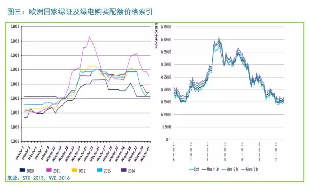 歐洲國家中實行綠電配額制的國家有英國、意大利、瑞典、挪威、波蘭及羅馬尼亞,其它國家的綠證交易只是電力來源標(biāo)識規(guī)定下的自由交易。綠電強(qiáng)制配額和綠證有著相似之處,但是綠證和綠電配額交易是互不相通的,綠證持有不可以抵消綠電配額。從二者價格區(qū)別上可以更加明確這一點,圖左是北歐斯堪的納維亞水電站從2010到2014年間的綠證價格發(fā)展,基本在0.2歐/MWh到0.8歐/MWh之間浮動,其中2011年3月的福島第一核電站事故刺激綠證價格大幅上抬(紫色折線),隨后又歸于平穩(wěn)。圖右是2006到2012年挪威的綠電配額elcert價格,最高可達(dá)38歐/MWh(376SEK/MWh)。綠證及綠證強(qiáng)制配額價格間的巨大差異與政策推行的目的達(dá)成呈正相關(guān),卻又影響強(qiáng)制配額執(zhí)行方的利益發(fā)展,所以二者之間的平衡點或者其它創(chuàng)新或許可成為新的模式。