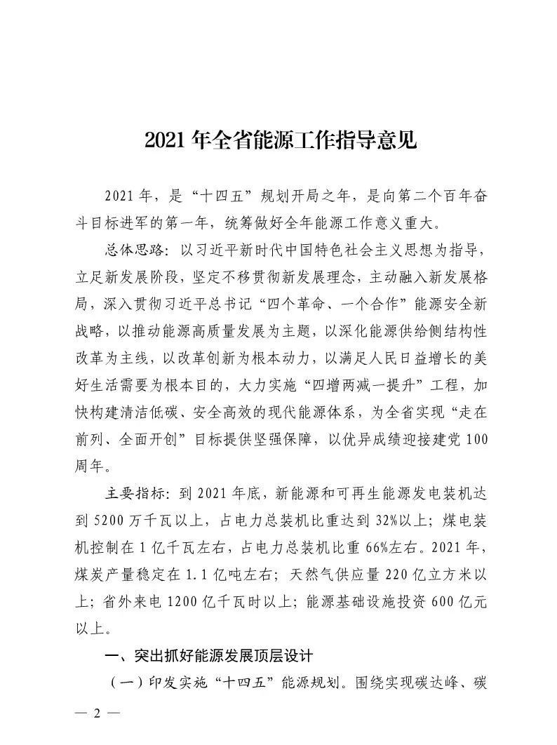 2月19日,為統籌做好2021年全省能源工作,加快推動新時代能源行業高質量發展,山東省能源局研究制定了《2021年全省能源工作指導意見》(以下簡稱《意見》),對2021年全省能源發展工作作出指導性部署安排。《意見》提到,到2021年底,山東省新能源和可再生能源發電裝機達到5200萬千瓦以上,占電力總裝機比重達到32%以上;煤電裝機控制在1億千瓦左右,占電力總裝機比重66%左右。2021年,煤炭產量穩定在1.1億噸左右;天然氣供應量220億立方米以上;省外來電1200億千瓦時以上;能源基礎設施投資600億元以上。