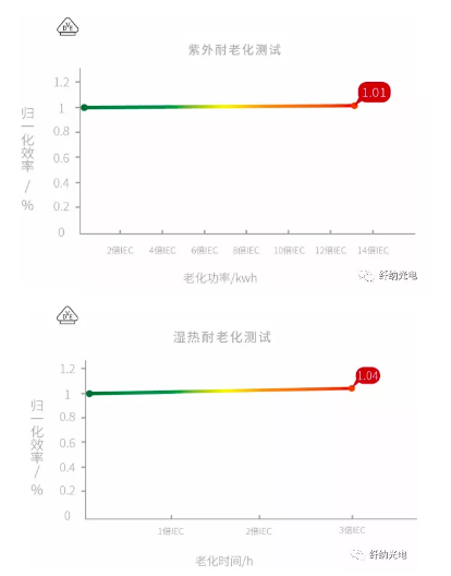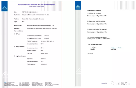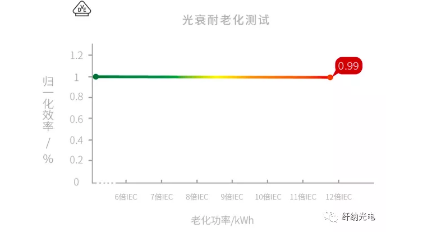 此次認(rèn)證的內(nèi)容分別是紫外、濕熱和光衰三項(xiàng)核心耐老化加嚴(yán)測(cè)試。其中,紫外耐老化測(cè)試的總量為100 kWh,等同于IEC61215標(biāo)準(zhǔn)的6.5倍;濕熱耐老化測(cè)試3000 h,等同于IEC61215標(biāo)準(zhǔn)的3倍。兩項(xiàng)測(cè)試組件功率衰減均小于5%。在為鈣鈦礦組件量身定制的更嚴(yán)苛的加熱光衰老化測(cè)試中,在70 ℃ 老化溫度以及一個(gè)標(biāo)準(zhǔn)太陽(yáng)光1000 h持續(xù)照射后,組件功率基本維持在初始值。