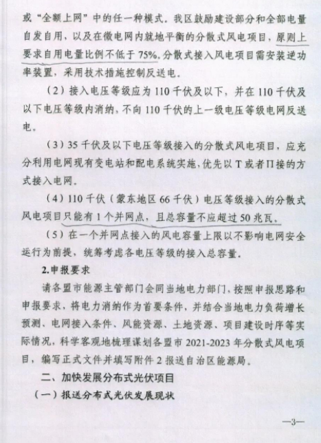 文件明確要加快發展分布式光伏項目。“十四五”期間,內蒙古自治區分布式光伏開發利用將重點支持在工業園區、大型建筑、公共建筑等用電負荷較大的區域,結合建筑條件發展屋頂分布式光伏,鼓勵光伏建筑一體化;支持充分利用農區牧區棚圈庭院、農光互補等形式建設分布式光伏系統,保障用能用電需求,助力鄉村振興建設;積極推動分布式光伏與儲能、微電網等融合發展,加快分布式光伏發電的推廣和利用。