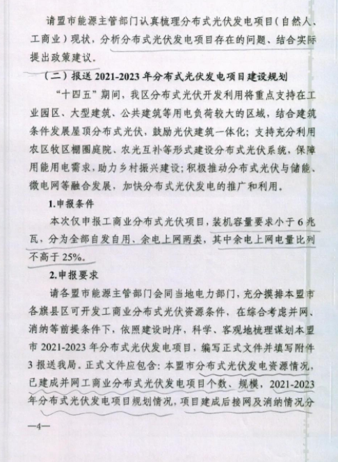 值得注意的是,此次僅申報工商業分布式光伏項目,裝機容量要求小于6MW,分為全部自發自用、余電上網兩類,其中余電上網電量比例不高于25%。