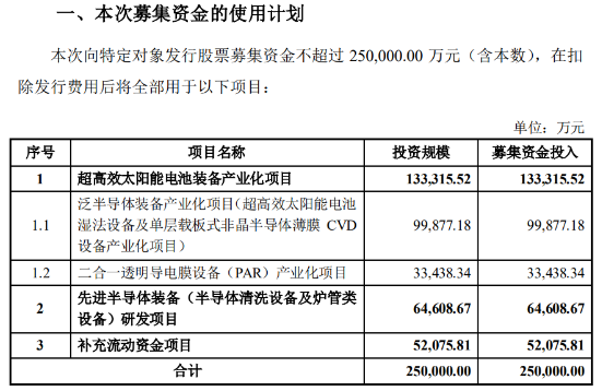 公告顯示,目前,光伏行業(yè)正處在PERC電池擴產(chǎn)高峰期,逐步向PERC+、HJT拓展階段,公司HJT電池生產(chǎn)設備國產(chǎn)化正在積極推進中,背鈍化技術氧化鋁鍍膜設備研發(fā)已形成批量生產(chǎn)銷售,PERC+電池工藝技術鈍化設備研發(fā)已進入工藝驗證階段。本次募集資金投資項目的建設,將釋放公司PERC+電池設備和HJT電池設備產(chǎn)能,加快公司產(chǎn)品升級迭代,進一步提升公司競爭力。