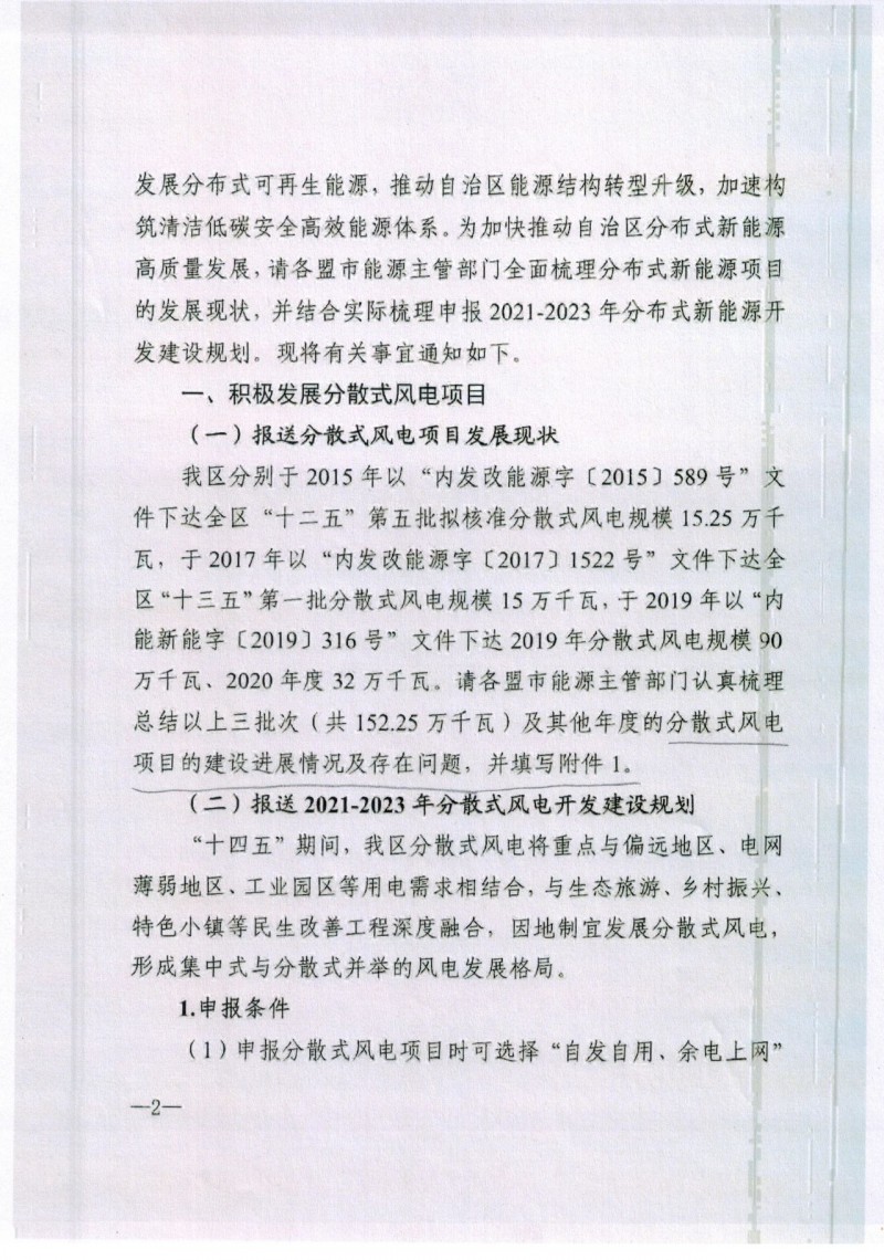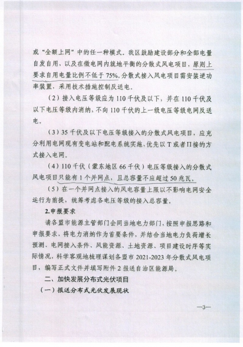分散式風電:單體規模≤50MW,可選擇“自發自用、余電上網”或“全額上網”中的任一模式,鼓勵建設部分和全部電量自發自用,以及在微電網內就地平衡的分散式風電項目,原則上要求自用電量比例不低于75%,分散式接入風電項目需安裝逆功率裝置,采用技術措施控制反送電。