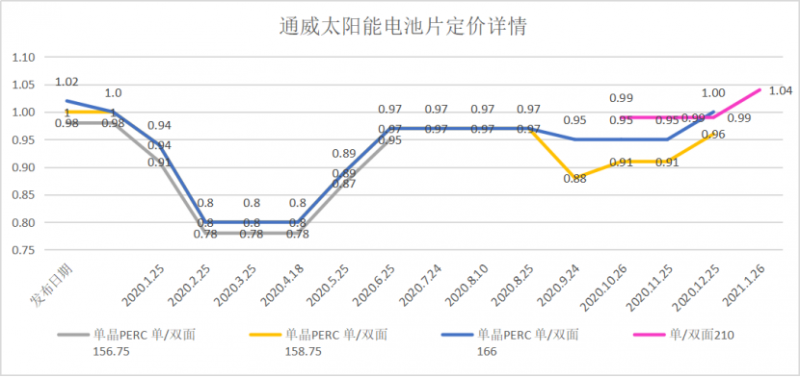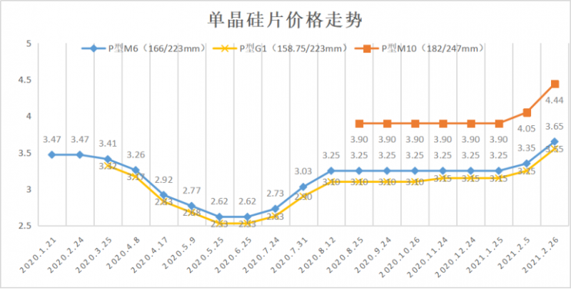 近日,單晶硅片龍頭隆基近日更新3月硅片報價,單晶硅片報價全面上調,其中G1、M6(170μm)單晶硅片報價3.55元/片、3.65元/片,每片上漲0.3元,漲幅高達9%;M10(175μm)單晶硅片價格上漲0.39元/片,漲至4.44元/片,漲幅高達9.6%。緊隨其后,通威宣布電池片價格也出現上漲,單晶電池全線上漲5分/瓦。