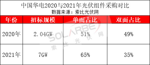 自2020年起,華電集團組件采購只選擇單晶組件。索比光伏網比較后發現,從采購規模來看,2021年華電組件采購7GW,比2020年的2.04GW增加243%;從組件類型來看,2020年華電單、雙面組件采購比例基本持平,但2021年雙面組件采購比例明顯下降,占比35%,比去年下滑14個百分點。值得一提的是,華電招標文件將組件分為單面單玻、雙面雙玻,并未考慮單玻+透明背板產品。