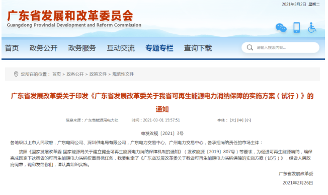 廣東省發(fā)展改革委關于我省可再生能源電力消納保障的實施方案(試行)