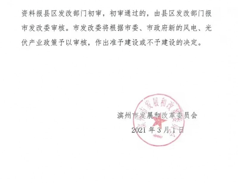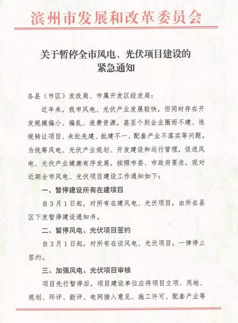 3月1日,山東省濱州市發改委下發《關于暫停全市風電、