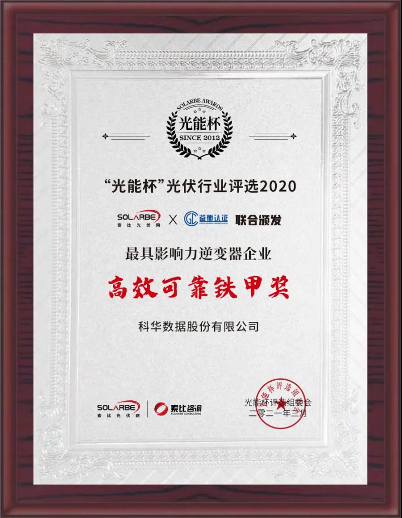 3月3日,2020“光能杯”跨年分享會在蘇州舉辦,在“光能杯”頒獎典禮上,科華憑借逆變器產品的安全可靠、高效智能等卓越品質,榮獲Solarbe和鑒衡認證聯合頒發的最具影響力逆變器企業之高效可靠鐵甲獎。