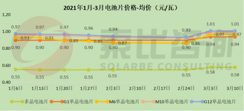 M10單晶電池片均價(jià)0.99元/瓦,最高成交價(jià)1.02元/瓦;