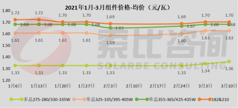182mm組件和210mm組件,均價(jià)1.70元/瓦,最高成交價(jià)1.75元/瓦。