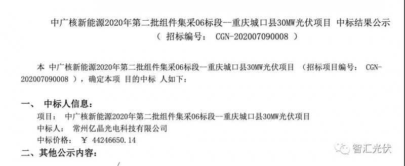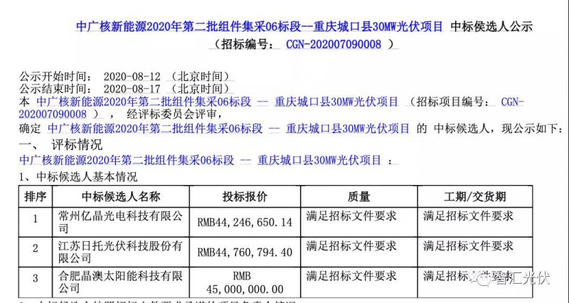 1.463元/W,億晶中標中廣核重慶30MW單晶組件