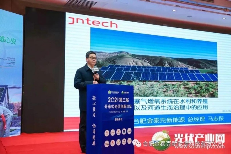 合肥金泰克新能源總經理馬志保做了主題為《光伏灌溉和曝氣增氧系統在水利和養殖以及河道生態治理中的應用》的演講,闡述了光伏作為新能源在國家智慧農業、水利領域、生態文明建設和美好鄉村領域的應用和推廣價值,展現了我們研發的光伏智慧灌溉系統和光伏曝氣增氧系統方案,并分享了我們在全球的光伏灌溉和曝氣增氧的應用經驗。