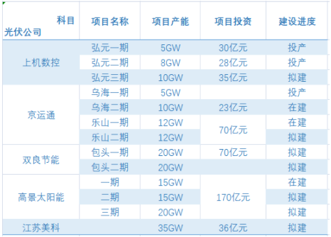 2017年起,京運通著手拓展硅片業務,公司現有項目分別位于內蒙古烏海及四川樂山。其中,烏海一期5GW產能已經投產,二期10GW正處于建設過程中;四川樂山項目設計產能24GW,分兩期實施,總投資約70億元,其中,一期12GW項目已開工建設。
