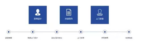 咨詢客服,免費上門設計,洽談/簽約協議,上門安裝,并網使用,安裝完成。