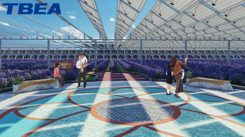 基于基地觀光需求,創(chuàng)新性的利用柔性光伏支架高空間、大跨度的優(yōu)勢,在下方設(shè)置了親子農(nóng)場、歡樂沙灘、采摘樂園、幸??觳蛙嚨刃蓍e旅游景觀。此外,結(jié)合薰衣草的觀賞屬性,在柔性光伏支架下設(shè)計(jì)了“薰衣草花海”觀景臺(tái)。光伏發(fā)電科技結(jié)合優(yōu)美的薰衣草花海,使得該景點(diǎn)成為當(dāng)?shù)鬲?dú)創(chuàng)的現(xiàn)代科技與自然景觀有機(jī)結(jié)合的典范,極大的增加了該基地的旅游觀賞價(jià)值。
